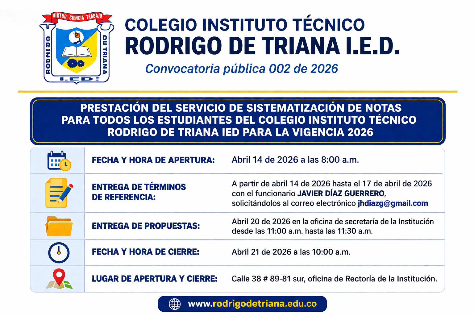El Colegio Instituto Técnico Rodrigo de Triana IED convoca a la comunidad rodriguista y al sector...